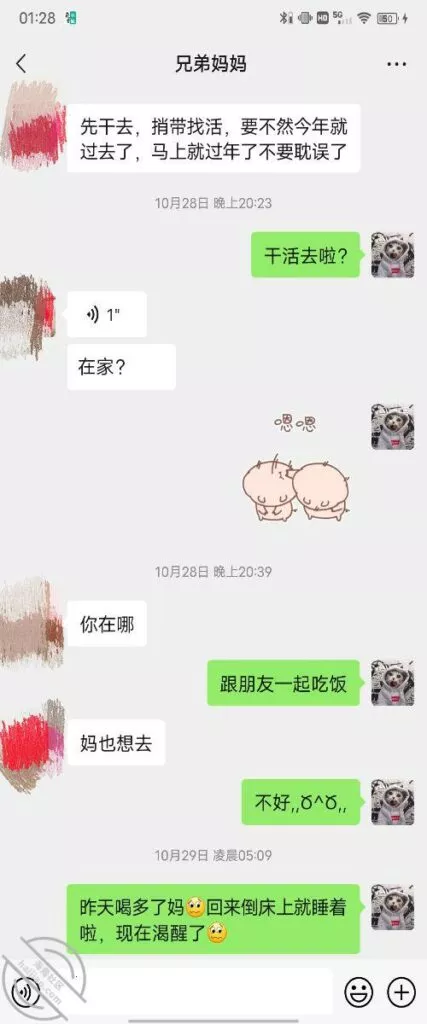 兄弟他妈到我在的这个城市打工,其实之前我都不知道他妈过来打工啦,后来听他妈说本来也没想着到这里打工,在家没什么收入,他爸在工地上班,她一个女人也干不了工地的活,没跟着他爸干活,朋友介绍就来这里啦,