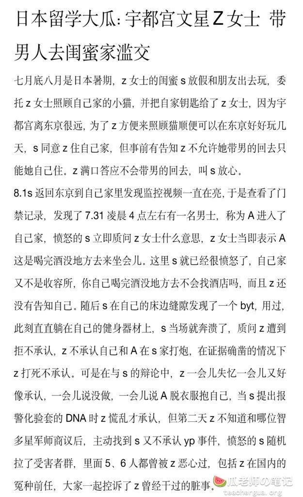 讲的是某日本留学生Z女士,奇女子一枚,相当银荡腐烂,在闺蜜家里约炮,TT丢的到处都是。
