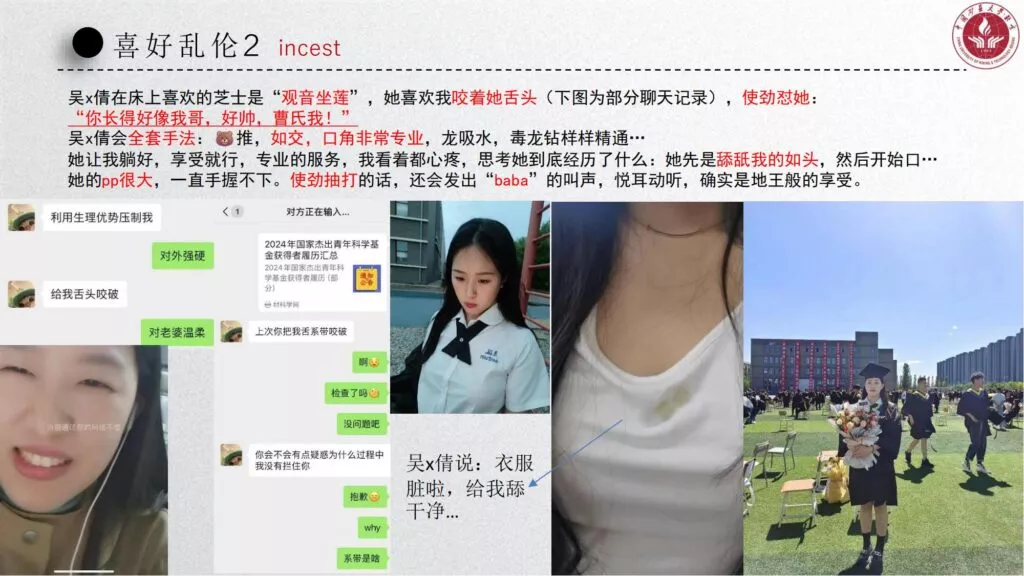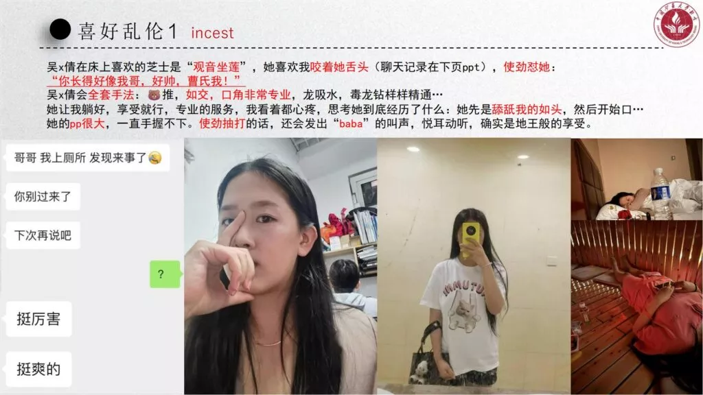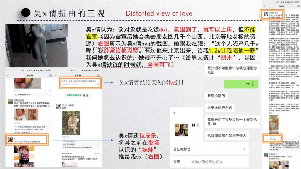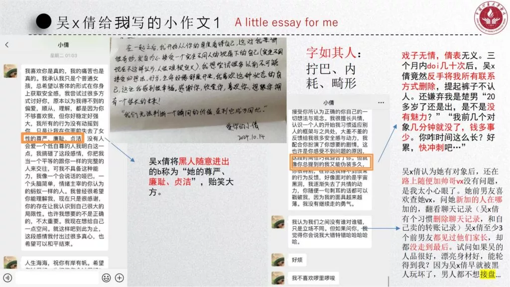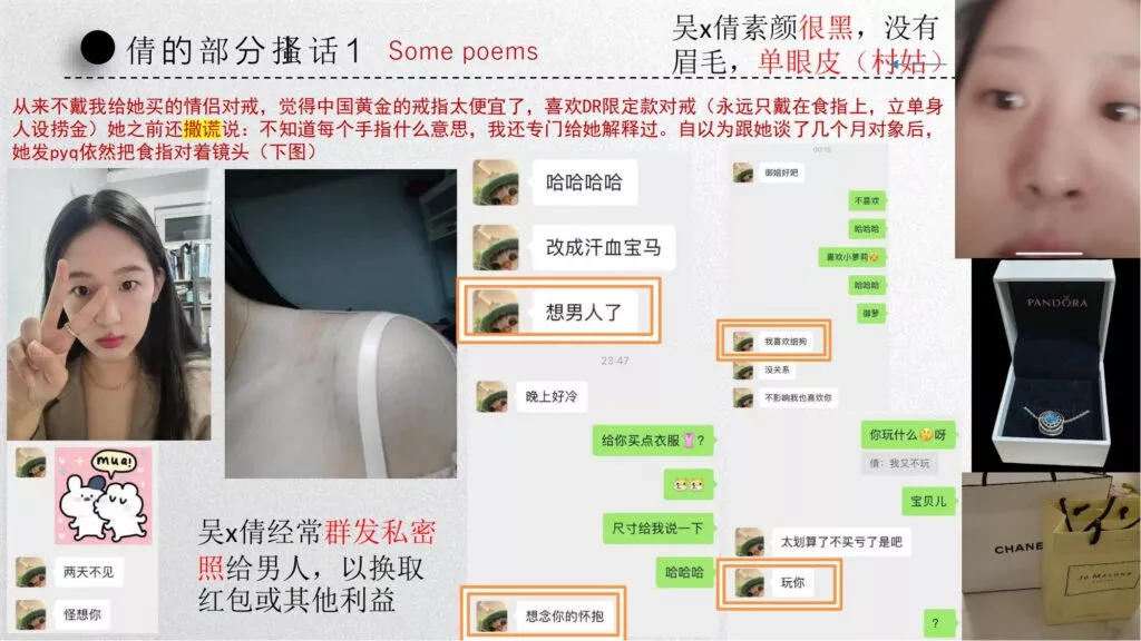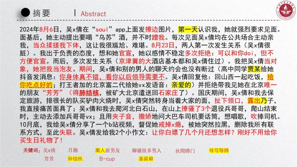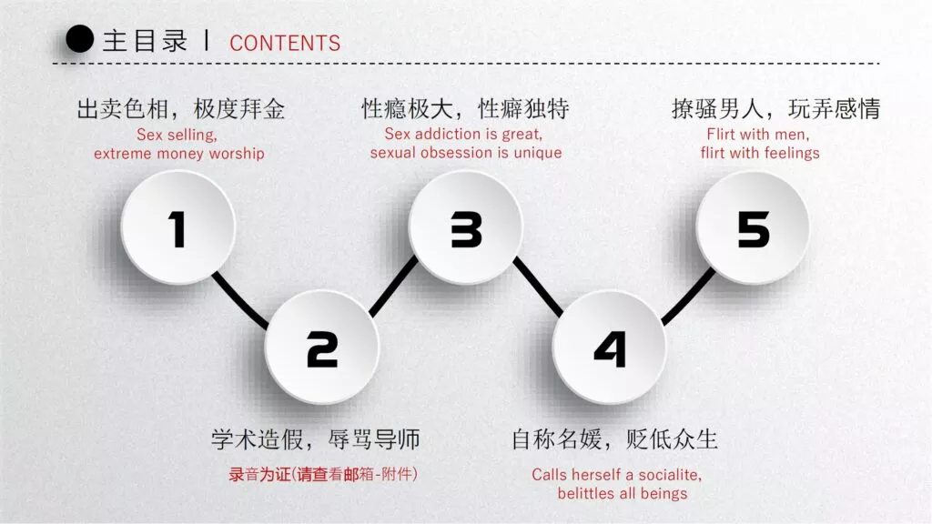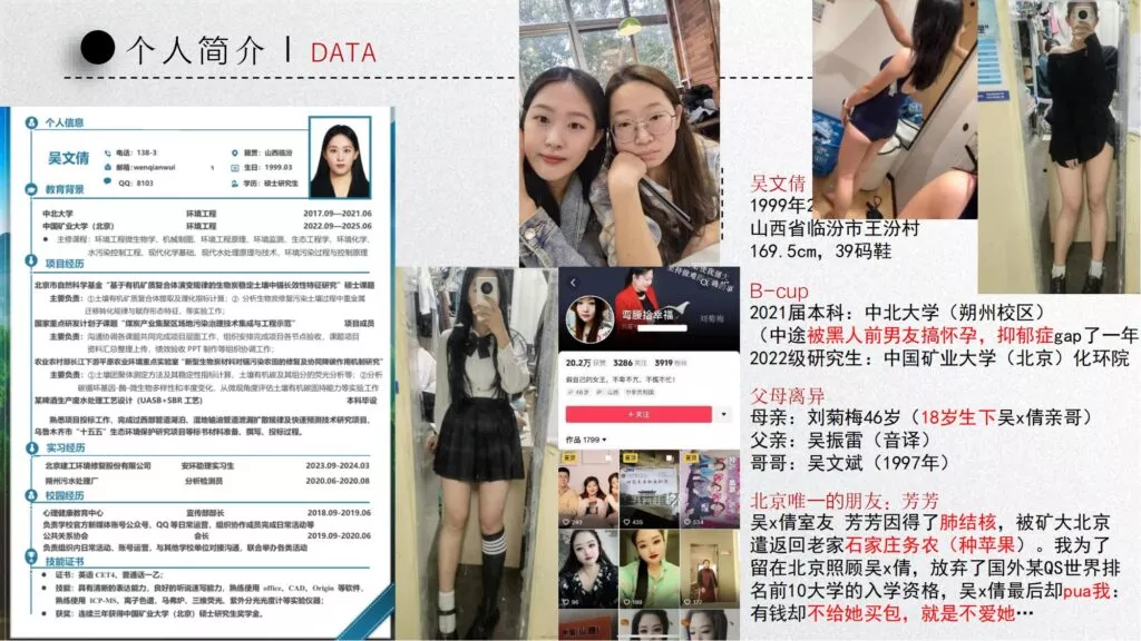 长文PPT再次引发关注,一份长达50页的PPT对矿大公交车上的吴文倩进行了严厉的抨击。她被描绘成极端拜金的女性,为了满足金钱需求在校外兼职做外围女,随叫随到。其中甚至不乏在公共场合突然脱衣露匈的惊人行为。她纵情于多位男生的感情,既不尊重导师,又涉嫌学术不端。