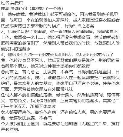 摩托圈顶级潲水男吴贵洪pua得吃失败,恼羞成怒之下开启造谣模式,得吃失败竟然选择这种报复方式,结果就是被造谣的女生带着亲友团堵门,这位潲水男也是罪有应得
